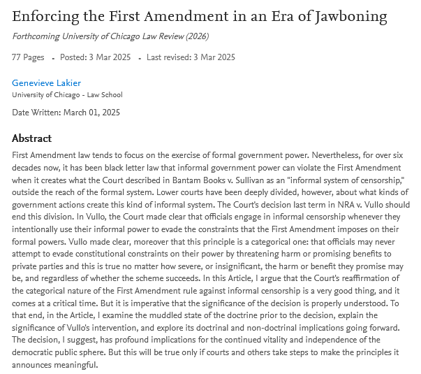 The importance of the rule helps explain why only last year a unanimous Court reaffirmed, in NRA v. Vullo, that it is a categorical one, and not governed by the ordinary ends-means balancing that applies in First Amendment cases. As I explain in a forthcoming paper, Vullo, dismissed by some as a nothing burger of a decision, is a landmark First Amendment decision. Although free speech doctrine has recognized that government threats can violate the First Amendment for over sixty years now, lower courts had struggled for decades to figure out when precisely government threats against private speakers were significant enough to violate the First Amendment. Vullo makes clear that the answer to this question is a simple one: always. That is to say: officials may never use the threat of adverse government action to coerce a private party into punishing or suppressing disfavored speech. It doesn’t matter how significant the threat of harm is. It doesn’t matter how compelling the interests the officials seek to further. And it doesn’t matter if the official had the power to exercise that power for non-speech suppressive purposes. As Justice Sotomayor put it in her majority opinion, “government officials cannot attempt to coerce private parties in order to punish or suppress views that the government disfavors.” Full stop.