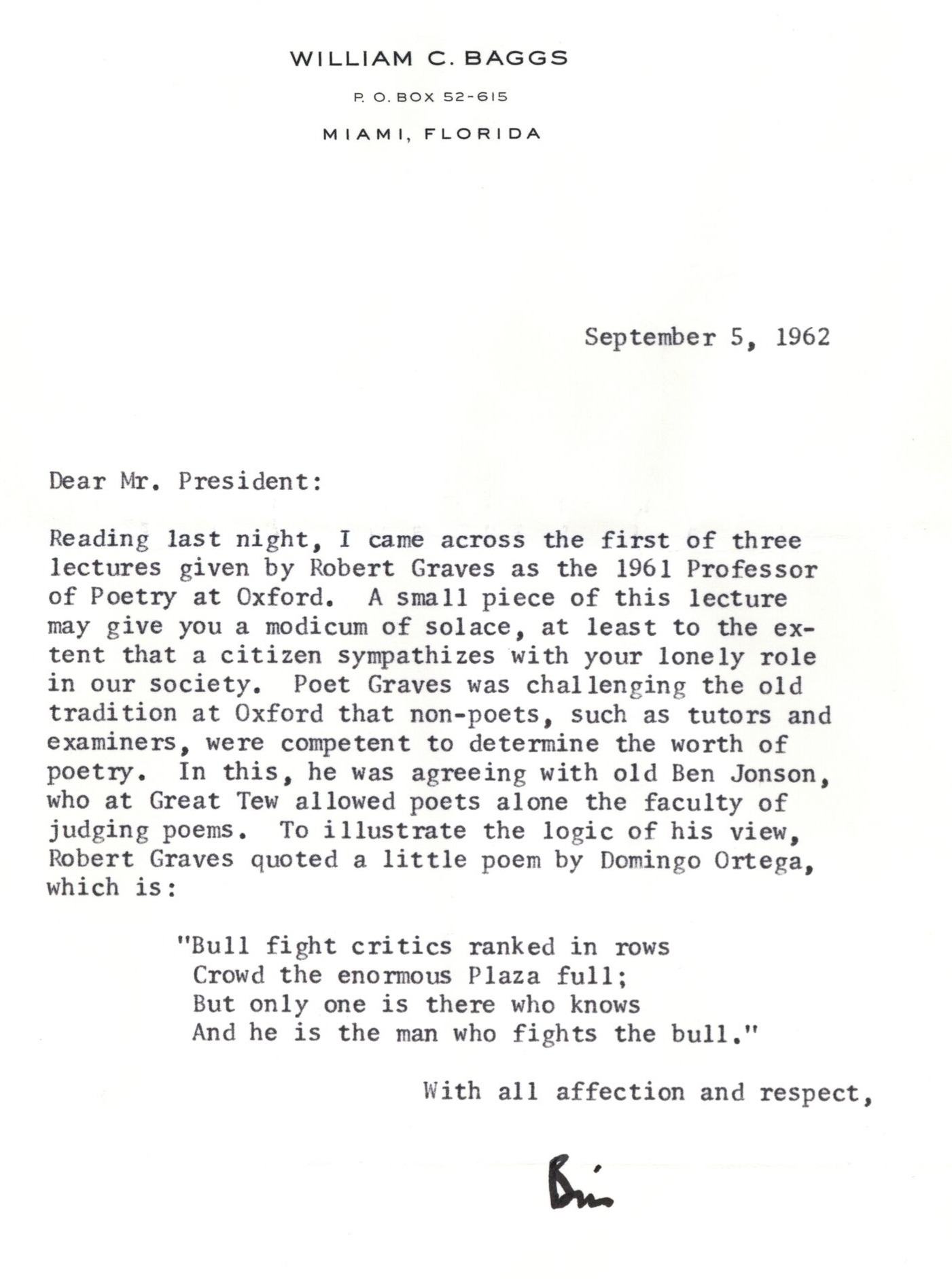 But one of our librarians, Keith Klein did find something else. In a folder described as: "materials maintained by President John F. Kennedy’s personal secretary, Evelyn Lincoln," there is a 9/5/62 letter from William C. Baggs, who was apparently the editor of the Miami News and a friend of Kennedy’s.