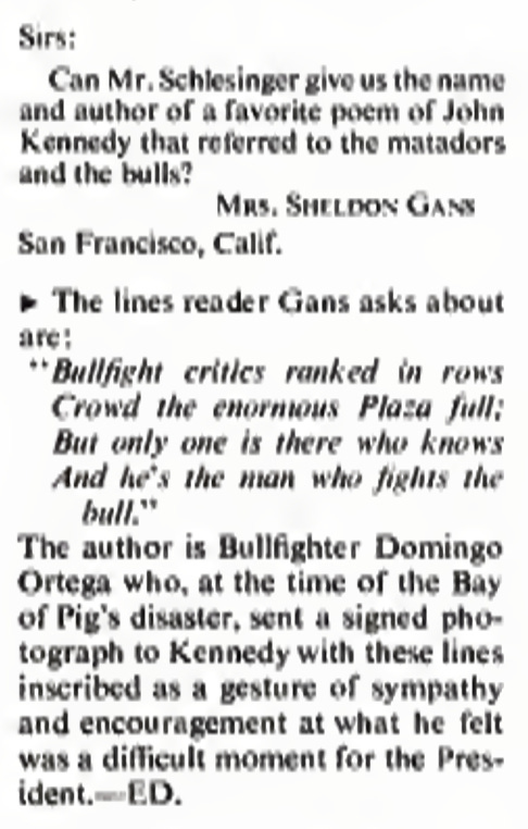 Then I found Life Magazine. In 1965, Life Magazine published an excerpt of Arthur Schlesinger Jr.’s Thousand Days, about the Kennedy administration. This seems to have inspired a reader to ask him about the source of the bullfight poem. In the Aug. 6, 1965 issue, the following Q&A appears in the letters to the editor: